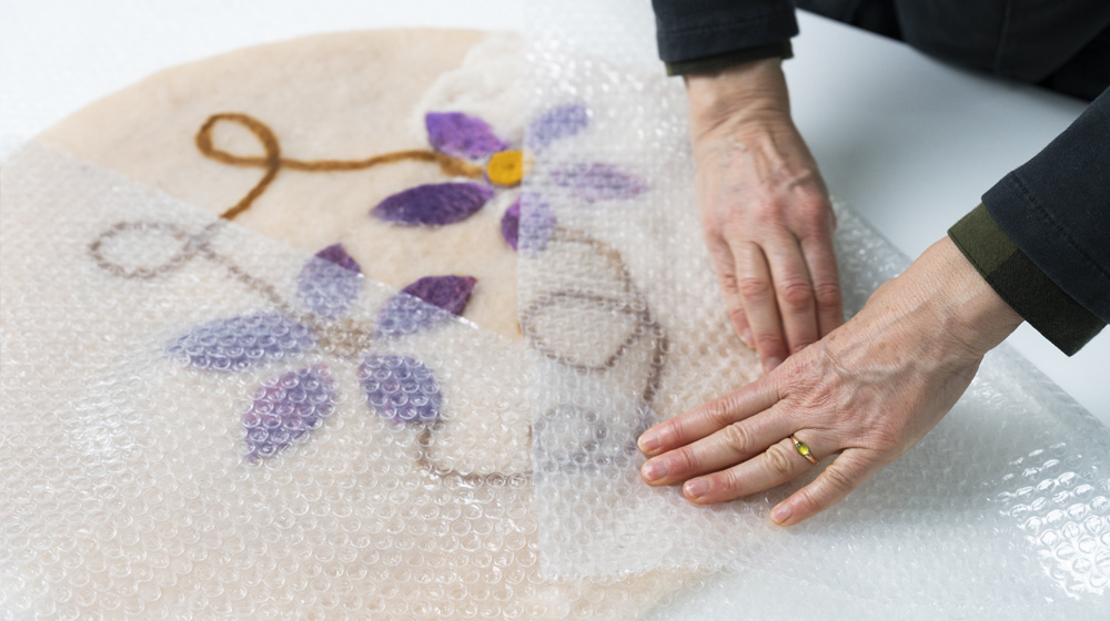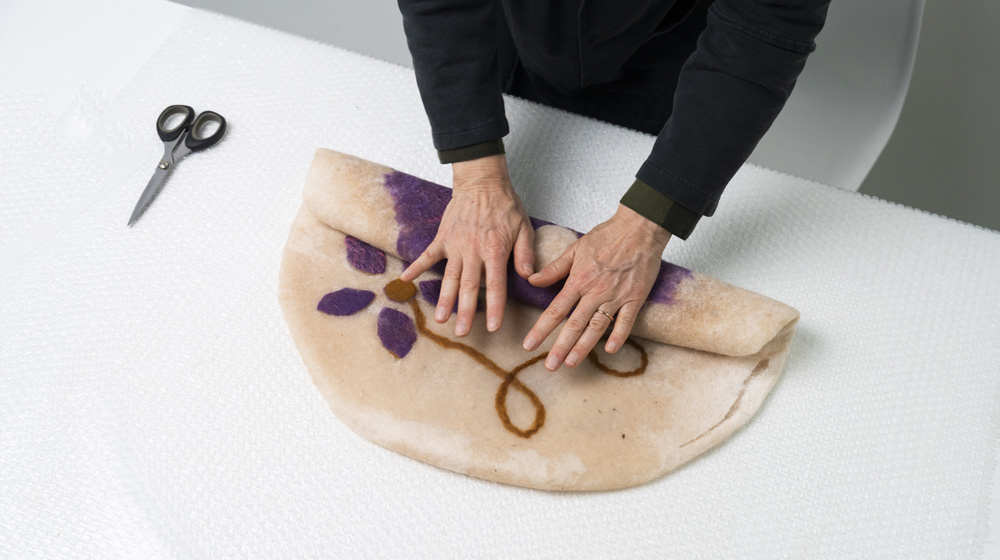 To felt further, use the rolling method. Start rolling, then rotate it from time to time on all sides, both right side and opposite face. Cut the cushion along one edge and remove the bubble cushioning wrap. Continue felting.