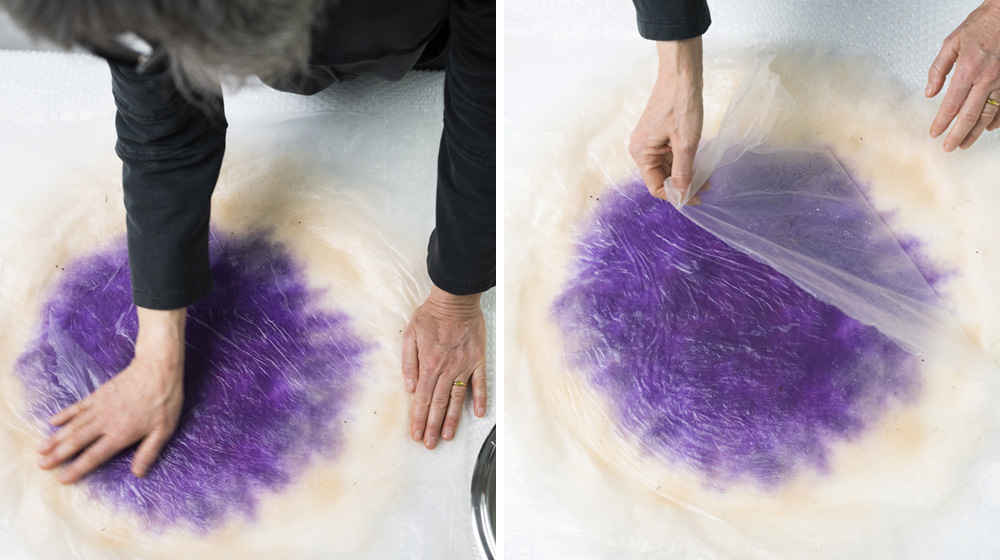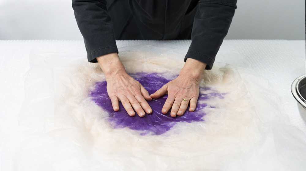 Take the Bergschaf wool color Violet and lay it out in small tufts over the viscose, completely covering it and doubling the diameter.
