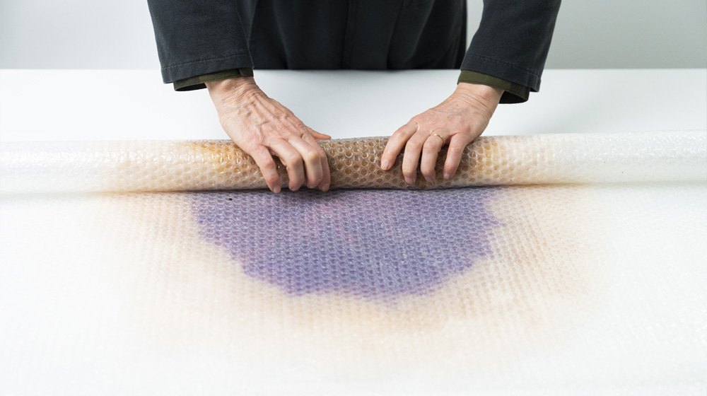 Spray soapy water over all the fibers again and press the work using a second sheet of bubble cushioning wrap. And to make your hands slide better on the bubble cushioning wrap, soap your hands. Wrap the work in bubble cushioning wrap to proceed with rolling and felt it further. Check the felting state and once optimal felting is reached, you can drain the excess water and partially dry it.
