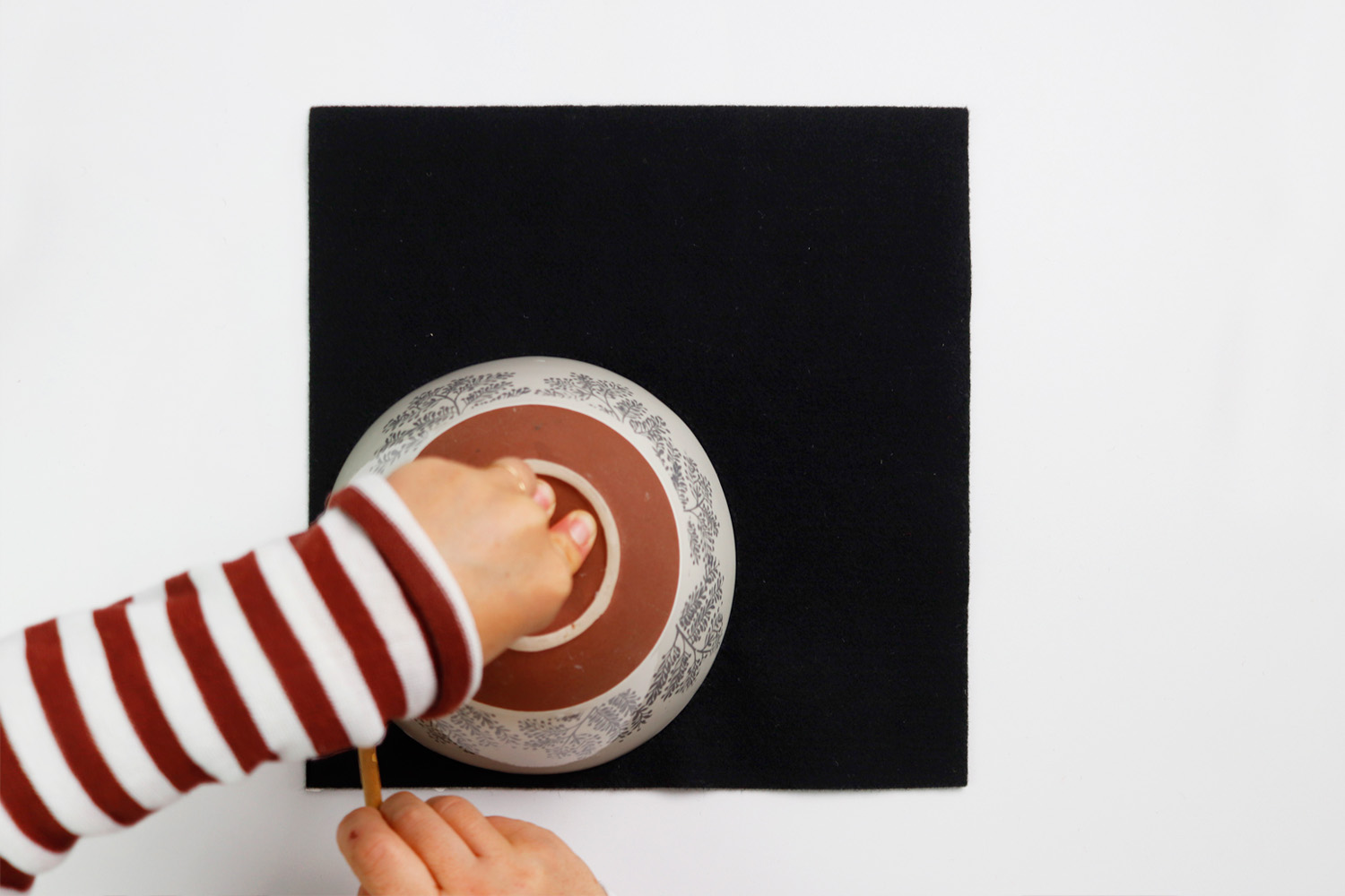 Use the bowl as a template to draw a circle on the black felt, making sure to draw a clear and defined line. This will be the base for the bat’s face.