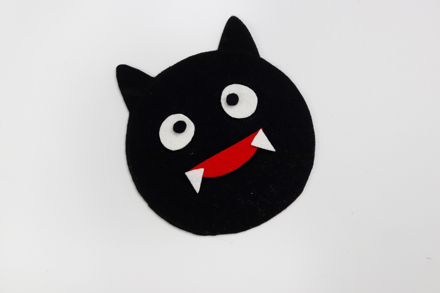 Use a hot glue gun to fix eyes, mouth, and teeth on the first felt shape. Be careful to avoid visible glue drips.