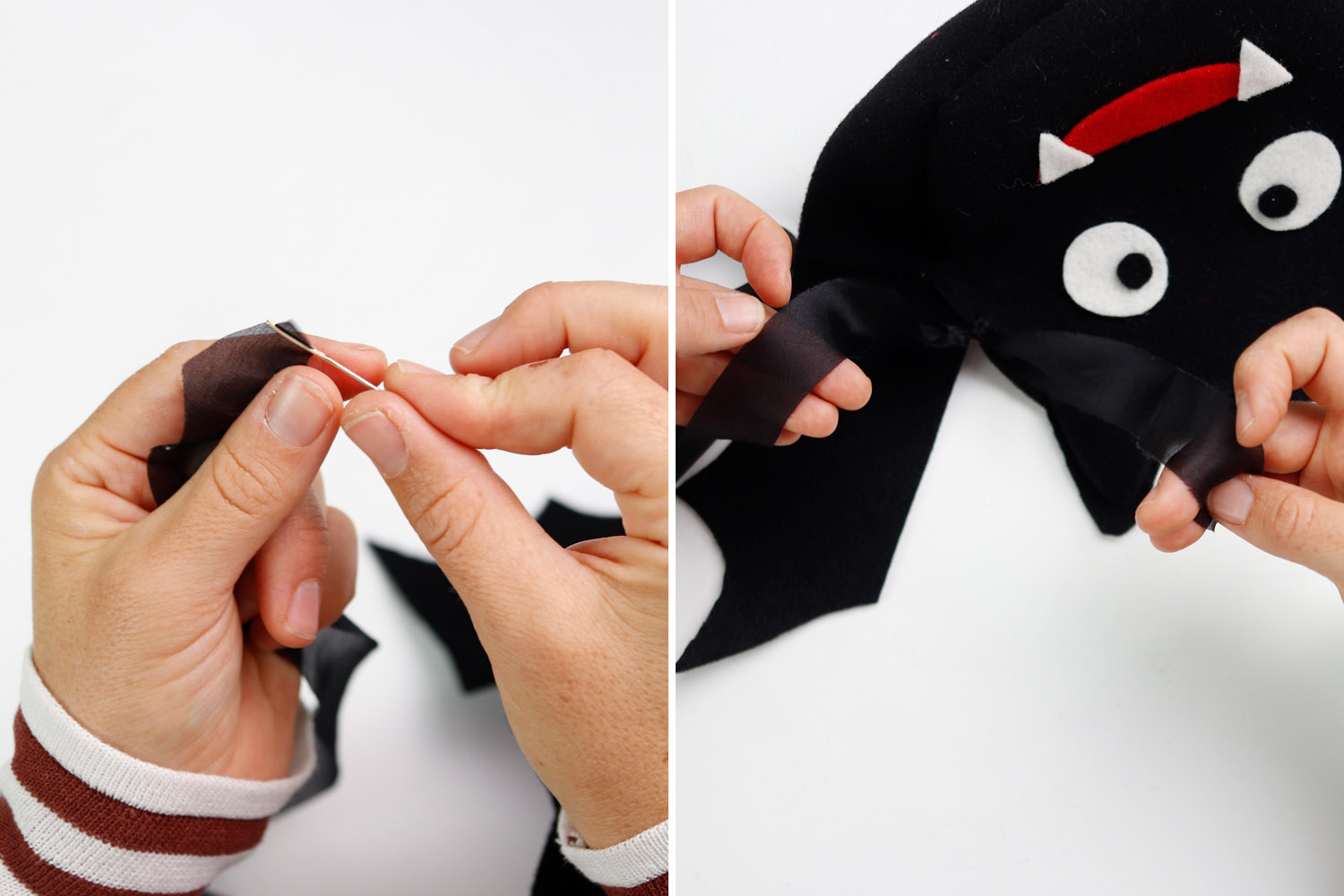 Use a needle to make two small holes at the top of the basket near the eyes. Tie at least three knots on each end to keep the ribbon securely in place and prevent it from slipping out.