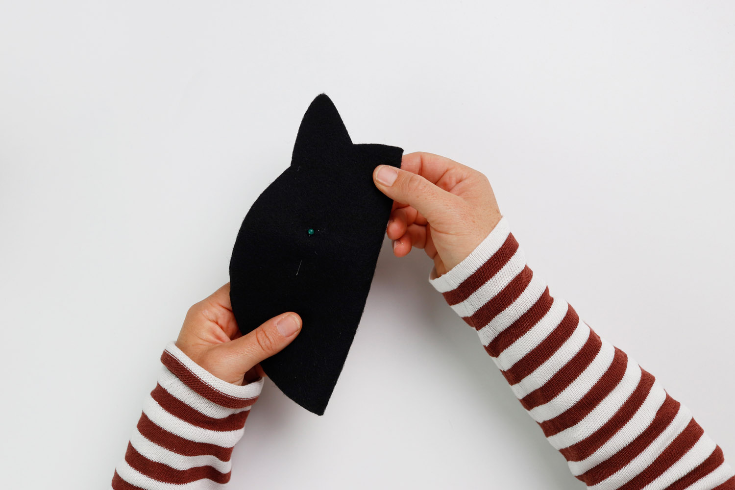 Tip: once you reach halfway through the shape, fold it in two and secure it with a pin, overlapping the two halves. This way you can check if the ears are symmetrical. If they’re not, you can follow the cut edge of the first ear to adjust the second.