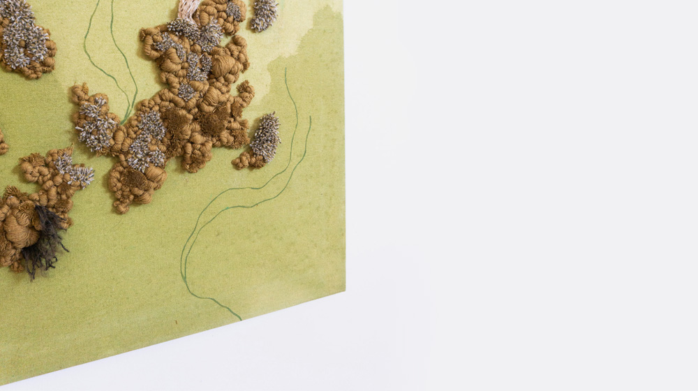 Each piece is meticulously handmade using a mixture of techniques, including embroidery, weaving, latch hook, and other experimental methods.
