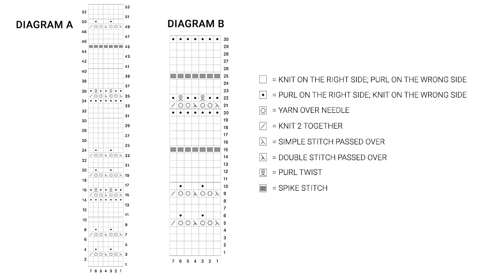 Right side: knit 5 garter stitches, 1 stockinette stitch, DIAGRAM A, 1 stockinette stitch, 5 garter stitches
