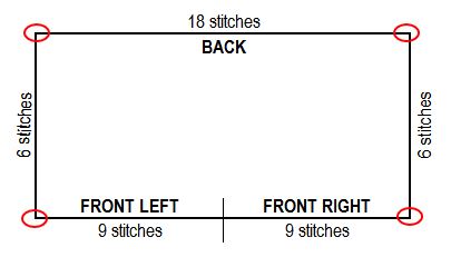 Co 48 sts placing stitch markers after the 9, 6, 18, 6 sts.