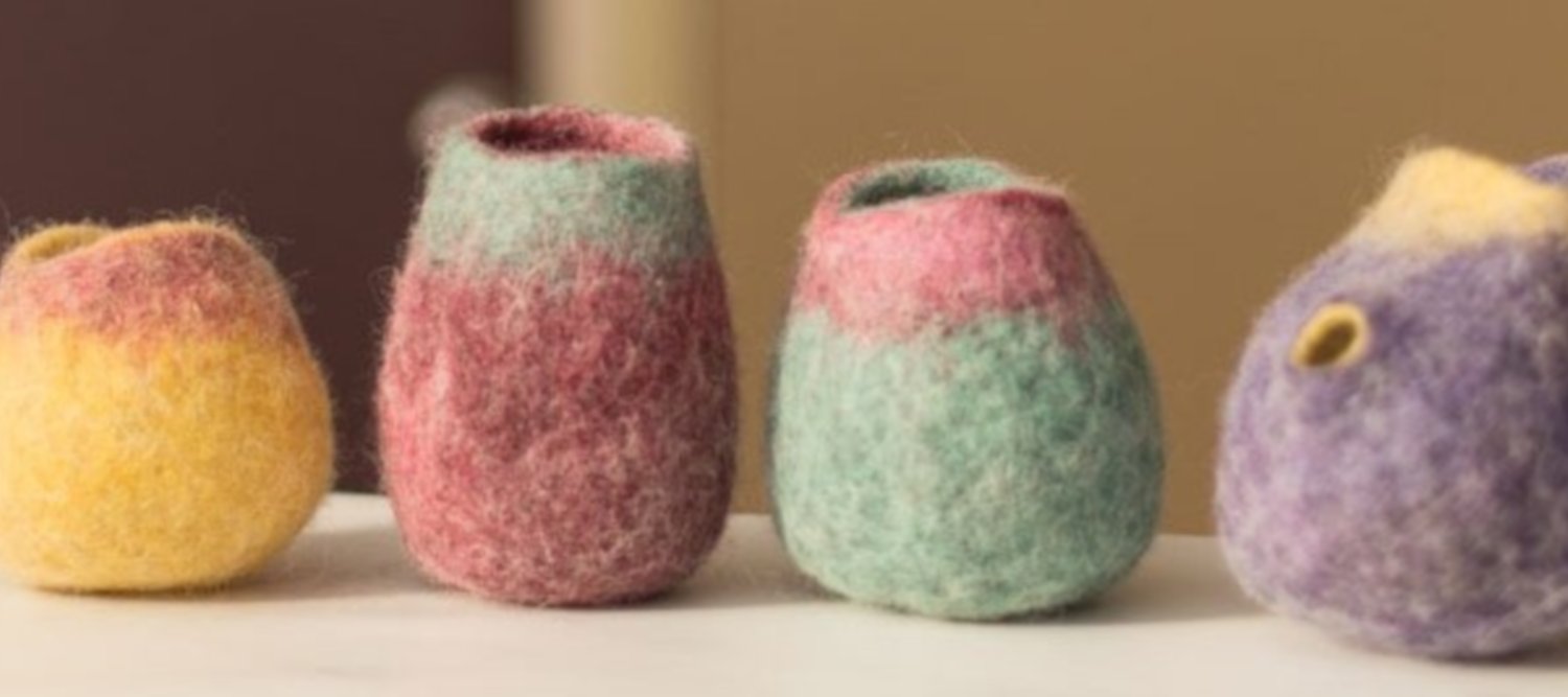 Il risultato è davvero a metà: più 'secco' e stabile del feltro che ottengo con la maori, colorato come piace a me e con un pizzico di morbidezza in più. Un po' metodica lo sono anche io: ho provato a mettere la bergschaf sotto e il colore sopra, ad usare il mix solo all'esterno, a stendere la metà destra di una fibra e la sinistra di un'altra. Tutto molto istruttivo, non smetto mai d'imparare. Poi ad un certo punto è mancato quel pizzico di lana che mi serviva per completare un ultimo oggettino, ho dovuto metterci un diverso colore. E così, visto che il caso mi è amico, sono nati i piccoli contenitori lanosi con la 'bocca' a contrasto!