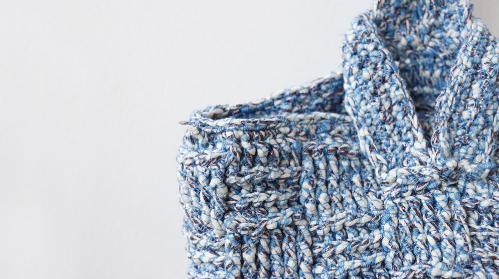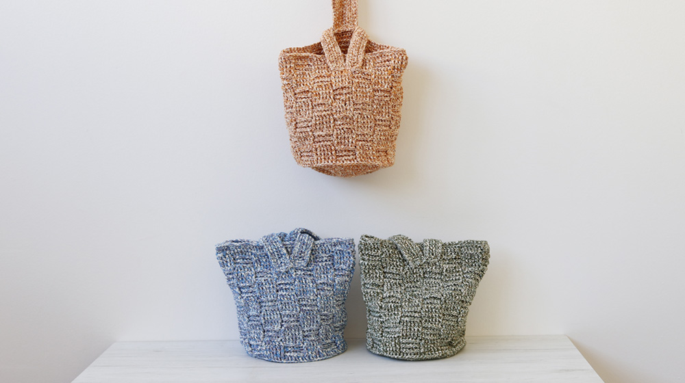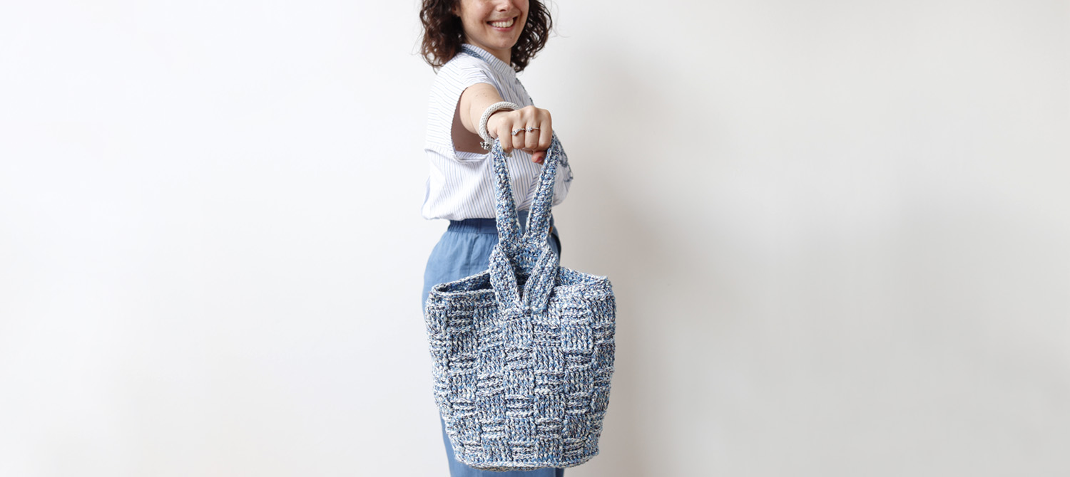 Qui hai tre varianti colori della borsa con punto canestro. Sullo shop hai molti altri colori di Ariel, il filato scelto per questo pezzo.