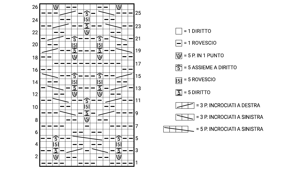 riga 25: lavorate 3 maglie a rovescio, 3 punti incrociati a sinistra, 1 maglia a rovescio, 5 maglie assieme a diritto, 1 maglia a rovescio, 3 punti incrociati a destra, 3 maglie a rovescio