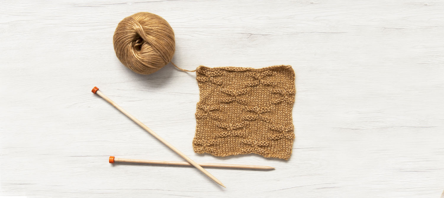 Rombi, nodini, una crostata dall'alto. Potete vederci quello che volete nel punto barrette pizzicate ai ferri. Ci piace perché il pattern è piuttosto semplice da realizzare e l'effetto finale è molto carino. Perfetto per una maglia o anche per una coperta. Il filato scelto è Hokusai, nel color Zafferano.