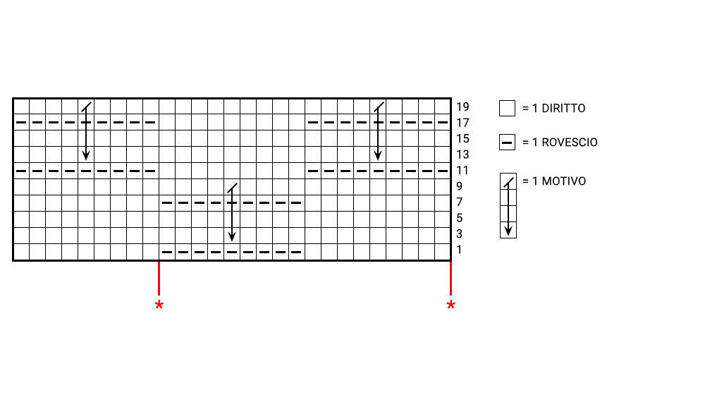 Ripetete da * a * per tutta la riga e terminate con i punti che seguono il secondo *. Nelle righe pari, non rappresentate sullo schema, lavorate tutti i punti come si presentano, diritto su diritto e rovescio su rovescio.