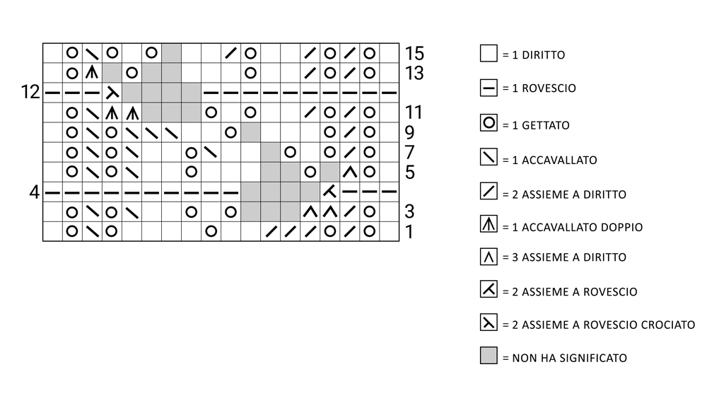 Nelle righe pari, non rappresentate sullo schema, lavorate tutti i punti e i gettati a rovescio, lavorate la riga 4 e la riga 12 come indicato.