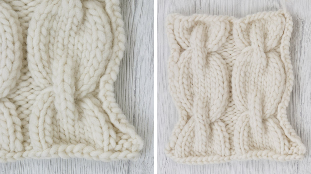 riga 9: *lavorate 3 maglie a rovescio, 9 punti incrociati a destra con costa centrale (tenete 3 punti in sospeso sul dietro, 3 punti in sospeso sul davanti, 3 diritto, lavorate a diritto i punti in sospeso sul davanti, lavorate a diritto i punti in sospeso sul dietro)*