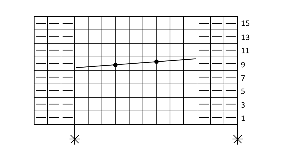 Nelle righe pari, non indicate sullo schema, lavorate i punti come si presentano: diritto su diritto e rovescio su rovescio. Ripetete da * a * per tutta la riga e terminate con i punti che seguono il 2° asterisco.