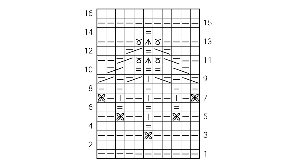 riga 11: lavorate 2 maglie a rovescio, 2 punti incrociati a sinistra a rovescio, 1 aumento a rovescio (= sollevate il filo orizzontale che unisce il punto precedente a quello successivo e lavorate una maglia a rovescio, ritorto), 1 maglia accavallata doppia (=1 punto passato, 2 maglie assieme a diritto, accavallate il punto passato), 1 aumento a rovescio, 2 punti incrociati a destra a rovescio, 2 maglie a rovescio