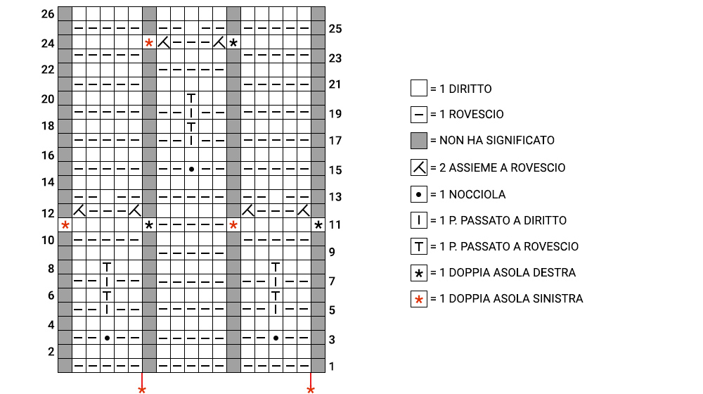 I punti a maglia rasata rovesciati ai lati del motivo non sono rappresentati sullo schema e non sono indicati nella spiegazione.