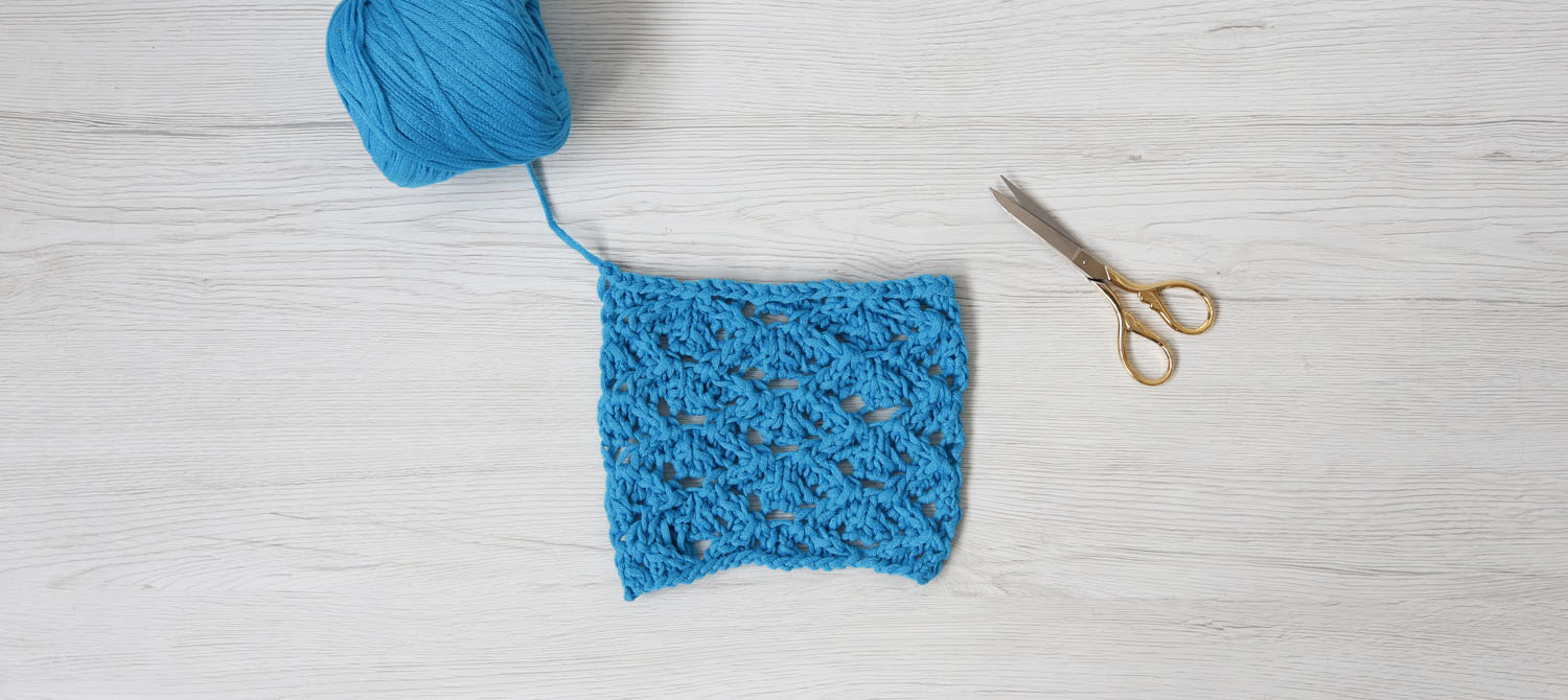 Per il punto Collinette Traforate abbiamo scelto il filato Sailorman, una fettuccia 100% cotone. I colori della collezione sono tanti, ma noi avevamo in testa solo il mare e allora abbiamo optato per il color Cobalto. Un tuffo dove l'acqua è più blu!