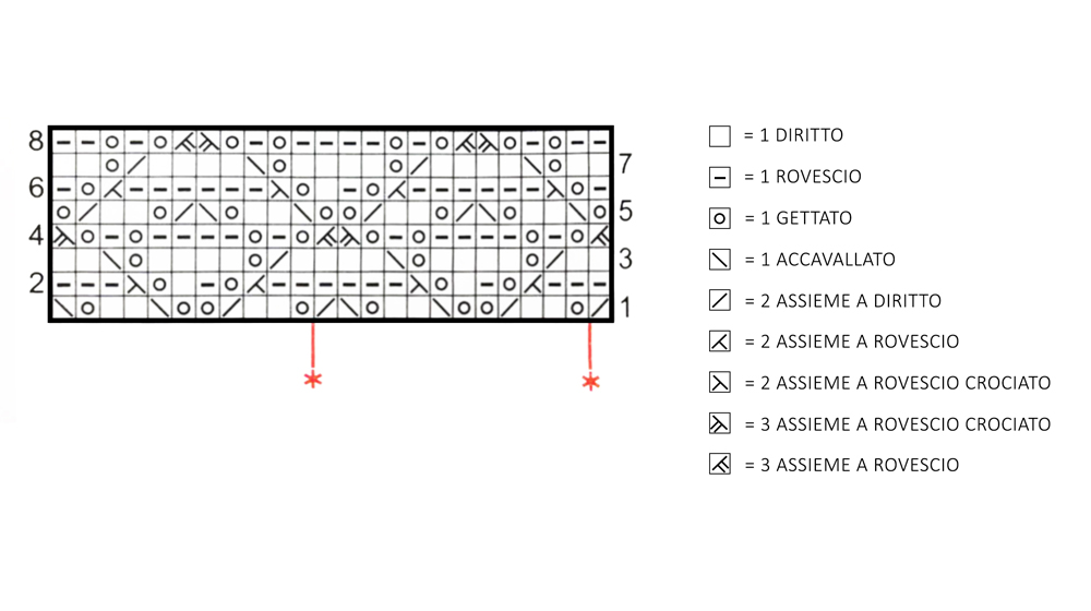 riga 7: 1 diritto, * + 1 diritto, 1 gettato, 1 accavallato, 4 diritti, 2 assieme a diritto, 1 gettato +, 3 diritti *, terminate lavorando da + a +, 2 diritti