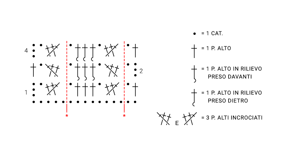 riga 2: 4 catenella (1 punto alto iniziale + 1 catenella), saltate l'archetto di 1 catenella, *3 punti alti incrociati, cioè saltate 1 punto alto, 1 punto alto in ciascuno dei 2 punti alti seguenti, poi da sinistra verso destra lavorate 1 punto alto nel precedente punto alto saltato, avvolgendo anche i 2 punti alti appena lavorati; 1 catenella, saltate l'archetto, 1 punto alto in rilievo preso davanti attorno a ciascuno dei 3 punti alti seguenti, 1 catenella, saltate l'archetto di 1 catenella*, ripetete da * a * e terminate con 3 punti alti incrociati, 1 catenella, saltate l'archetto di 1 catenella, 1 punto alto sulla terza catenella iniziale della riga precedente