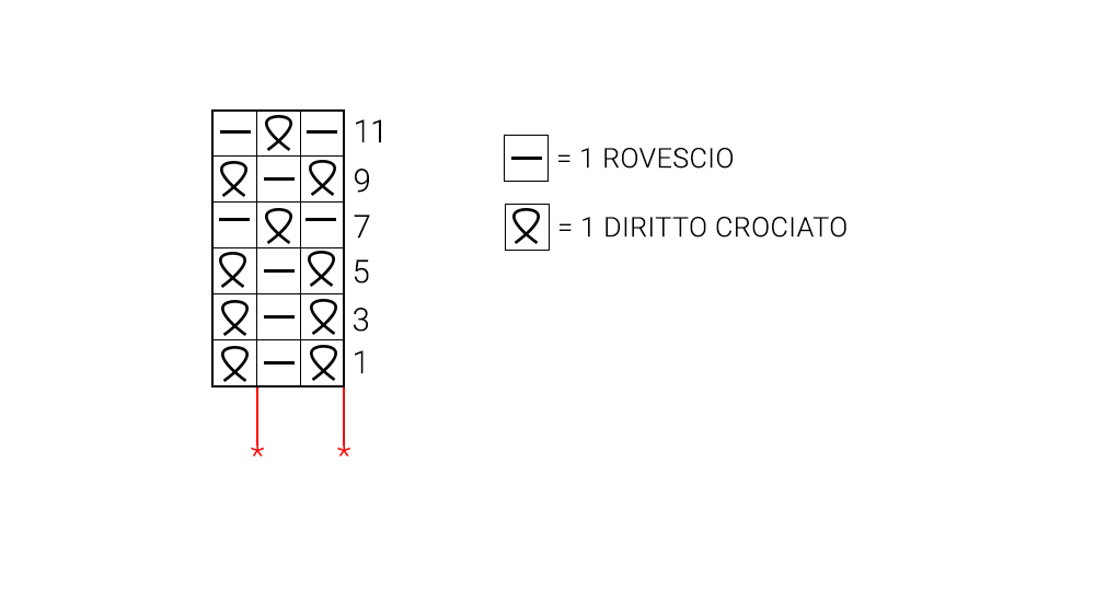 Ripetete da * a * per tutta la riga e terminate con il punto che segue il secondo *. Nelle righe pari, non rappresentate nello schema, lavorate tutti i punti come si presentano, diritto su diritto e rovescio crociato su rovescio crociato.