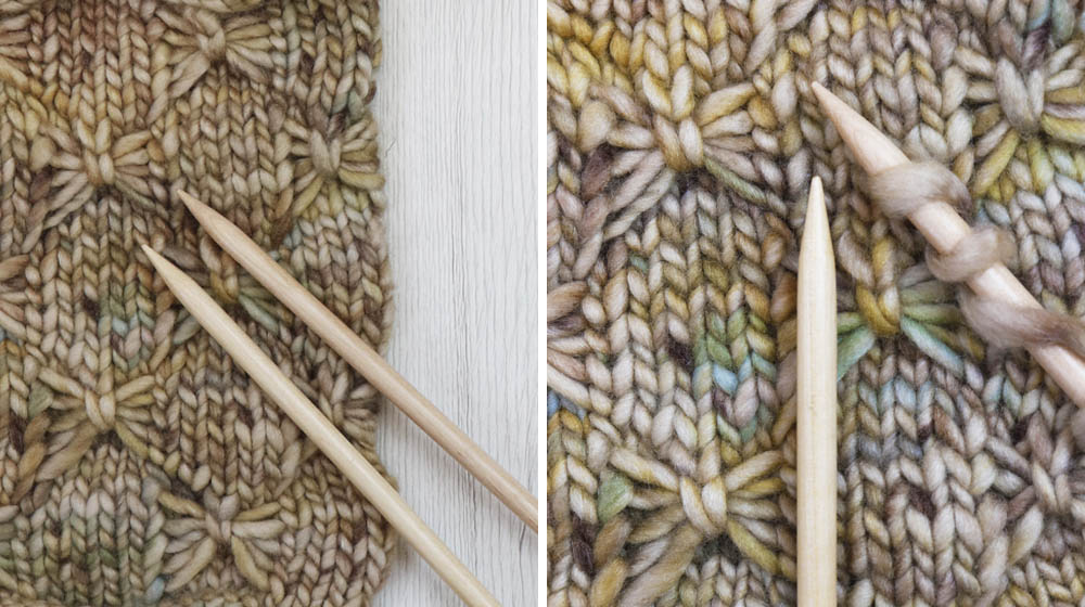 Per realizzare il punto farfalle abbiamo scelto il nostro Piuma in un colore della collezione Stampati, e cioè il color Arnia. Ci è sembrato perfetto per donare al punto maglia un tocco estroso e di grande effetto.