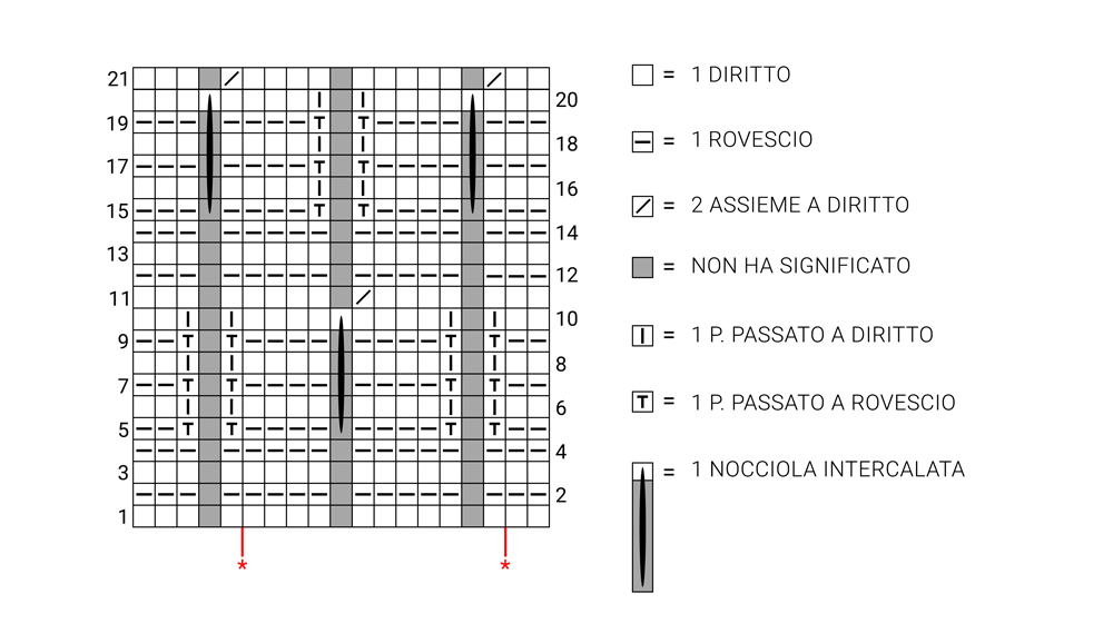 riga 20: 2 maglie a diritto, *1 maglia a diritto, 1 nocciola intercalata, 4 maglie a diritto, 2 punti passati a diritto, 3 maglie a diritto*, terminate con 1 maglia a diritto, 1 nocciola intercalata, 3 maglie a diritto