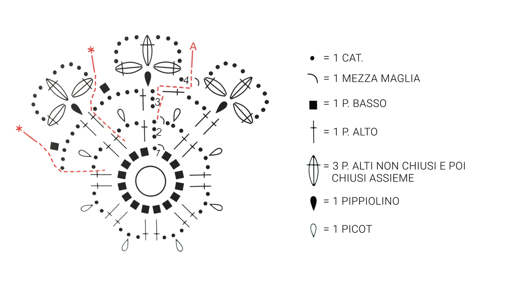 Dal giro 1 al giro 2 eseguite la parte data, dal giro 3 al giro 4 lavorate da A al 1° asterisco, ripetete da * a * per 6 volte e terminate con la parte che precede A.