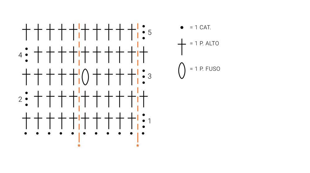 riga 3: 3 catenelle, * 1 punto alto su ciascuno dei 4 punti seguenti, 1 fuso [= (1 gettata sull'uncinetto, inserite l'uncinetto nel punto sottostante, 1 gettata sull'uncinetto ed estraete il filo, allungate l'asola sull'uncinetto fino all'altezza del punto precedente) ripetete la parte fra parentesi tonde altre 4 volte, 1 gettata e chiudete tutte le asole sull'uncinetto in una volta sola, 1 catenella per chiudere il fuso] *, ripetete sempre da * a *, terminate il giro con 1 punto alto in ciascuno degli ultimi 5 punti