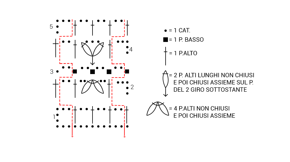 riga 4: lavorate 5 catenelle, saltate l'archetto, *1 punto alto sul punto basso seguente, saltate l'archetto, sulla costina di chiusura dei punti chiusi assieme della riga 2 sottostante lavorate 2 punti alti non chiusi e poi chiusi assieme, 3 catenelle e 2 punti alti non chiusi e poi chiusi assieme, saltate l'archetto, 1 punto alto sul punto seguente, 2 catenelle, saltate l'archetto*, terminate con 1 punto alto sul punto inziale della riga precedente