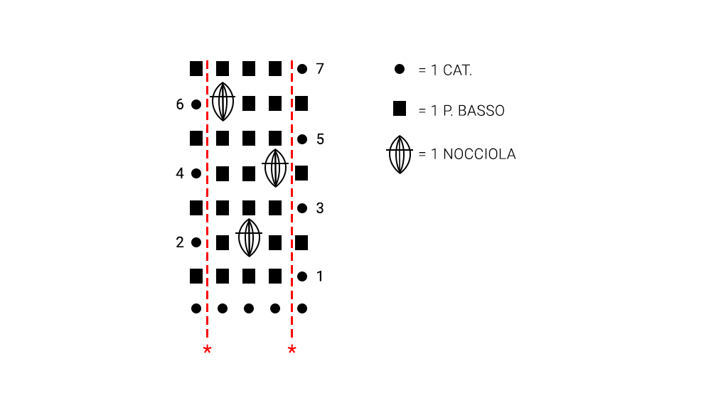 riga 2: lavorate 1 catenella, *lavorate 1 punto basso sul punto seguente, 1 nocciola sul punto seguente (sullo stesso punto di base lavorate 5 punti alti non chiusi e poi chiusi assieme), 1 punto basso sul punto seguente*, ripetete sempre da * a * e terminate con 1 punto basso sul punto iniziale del giro precedente