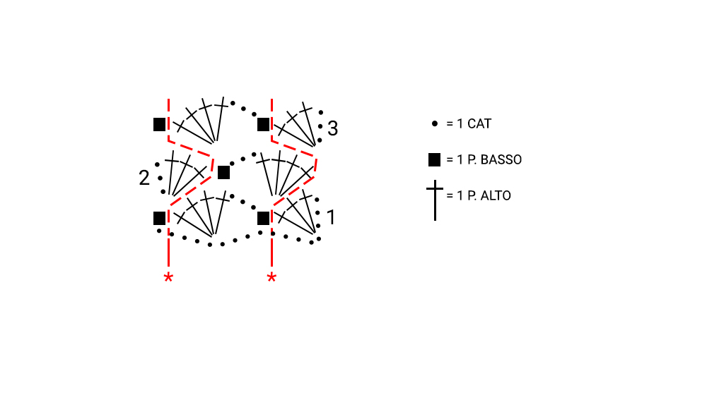 Riga 1: lavorate 3 catenelle, saltate 3 catenelle a partire dall'uncinetto, 3 punti alti nella catenella seguente, saltate 2 catenelle, *1 punto basso nella categoria seguente, 3 catenelle, saltate 2 catenelle, 4 punti alti nella catenella seguente, saltate 2 catenelle*, ripetete sempre da * a * e terminate con 1 punto basso nell'ultima catenella