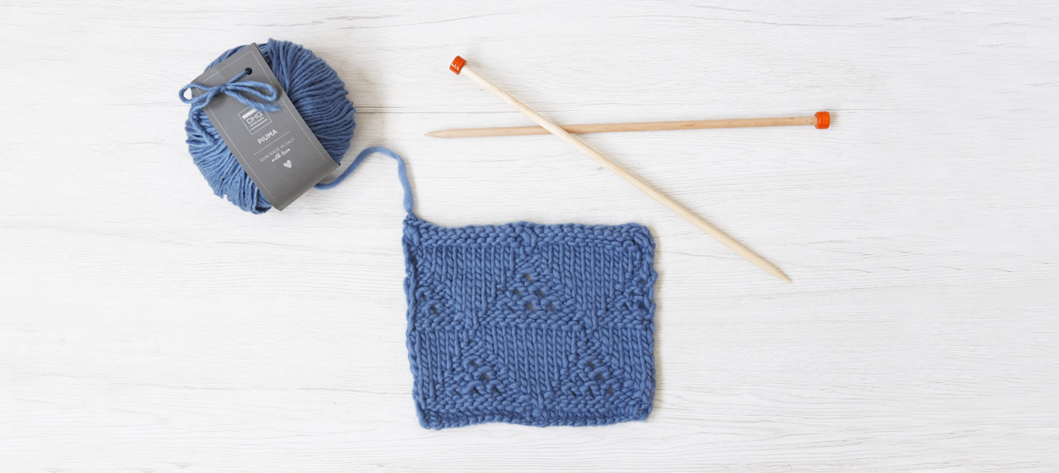 Eccoci con un altro punto maglia. Realizzato ai ferri e con il filato Piuma color Jeans, il punto Triangoli Traforati è piuttosto semplice e dona al capo finito, sia una coperta o un maglione, un volume super chunky.