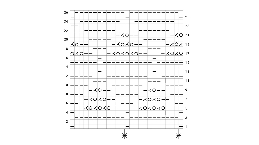 Riga 1 e 25: lavorate 1 maglia a rovescio, *lavorate 11 maglie a diritto e 1 maglia a rovescio*, ripetete sempre da * a *