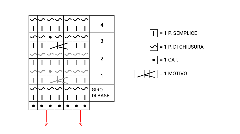 Iniziate con la parte che precede il primo *, ripetete da * a * per tutto il giro e terminate con la parte che segue il secondo *. Lavorate l'ultima riga come indicato nelle spiegazioni.