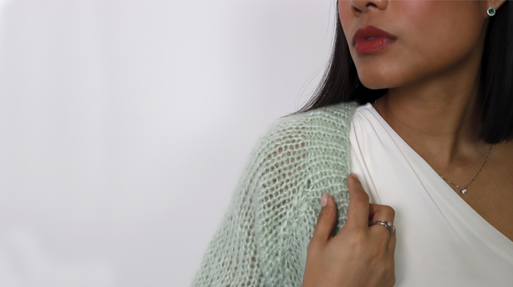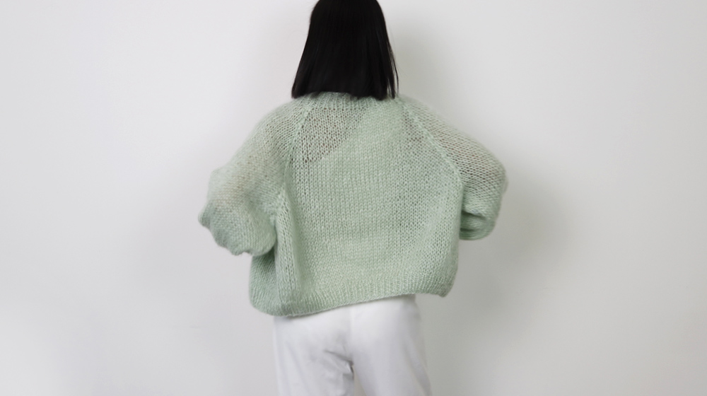 Un cardigan corto, leggero e caldissimo. Con una linea semplice e romantica. Perfetto per un look da giorno se scegli un colore chiaro e pastello come quello che vedi qui, il Mughetto. Oppure per un look da sera se deciderai di farlo in nero. In ogni caso, per ottenere un cardigan bello come questo, devi utilizzare il nostro filato Fluffy in mohair e seta.