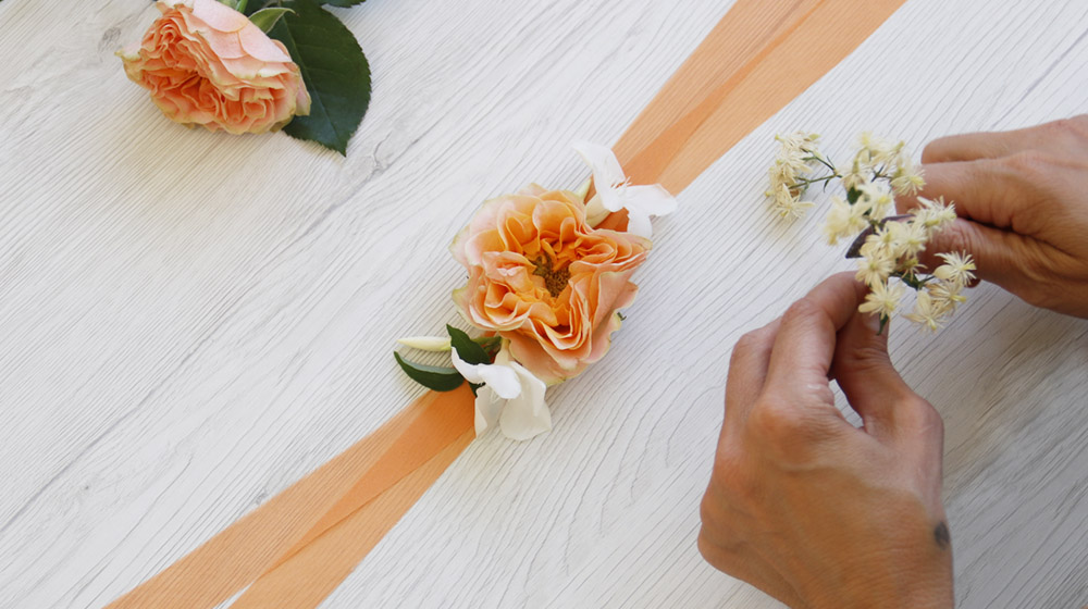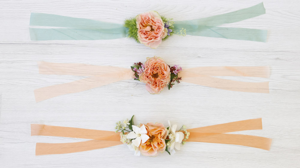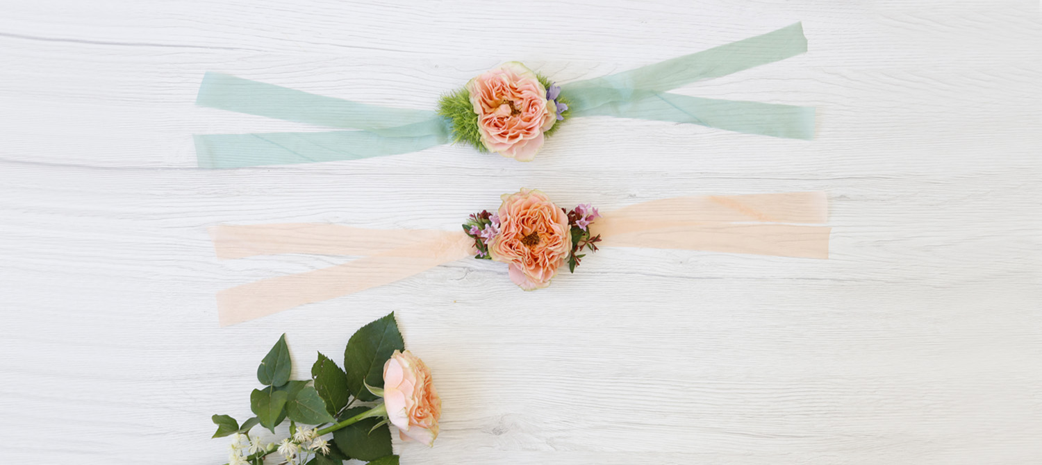 Noi abbiamo realizzato il nostro corsage con l’aiuto di Silvia Labanti | Stamen Studio, floral designer super raffinata. Protagonisti i nostri nastri in seta chiffon e dei delicati fiori freschi.
