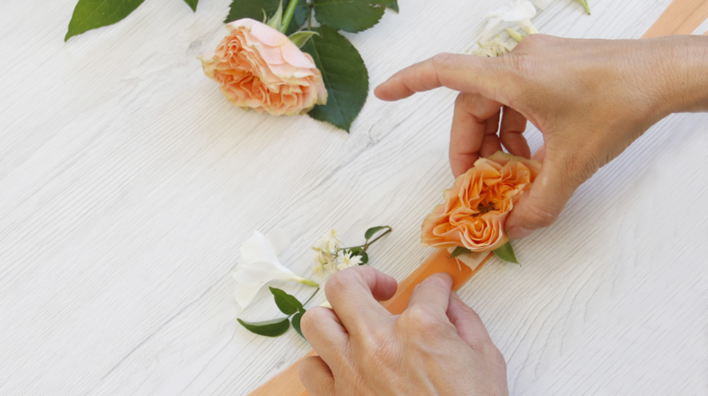 Anche in questo caso lasciate asciugare per 15 minuti. Trascorso questo tempo assicuratevi che gli elementi floreali siano ben fermati al nastro.