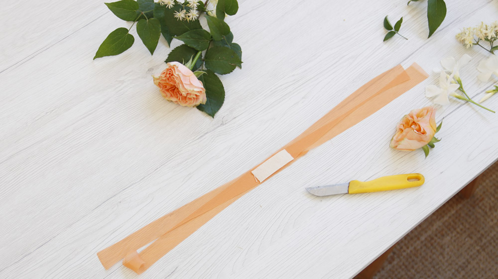 Per prima cosa disponete sul tavolo tutti i materiali che avete scelto di usare. Successivamente tagliate 2 pezzi di nastro seta chiffon di circa 40 cm / 15.7" ciascuno e incollateli tra di loro al centro. Applicate sempre con la colla un pezzo di nastro di cotone di 4 cm / 1.6" circa che servirà come supporto per poi incollare i fiori.