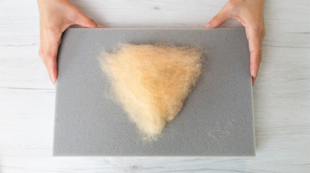 Per prima cosa prendete il color Acacia e create un triangolo equilatero, adagiate bene i ciuffetti di lana sulla base e formate un letto di fibra alto circa 2 dita.