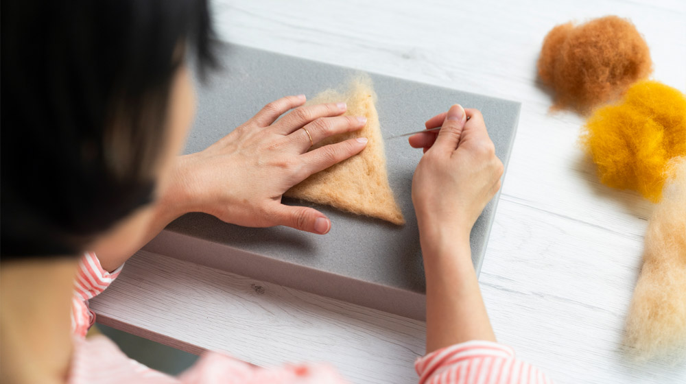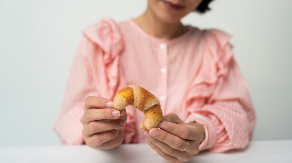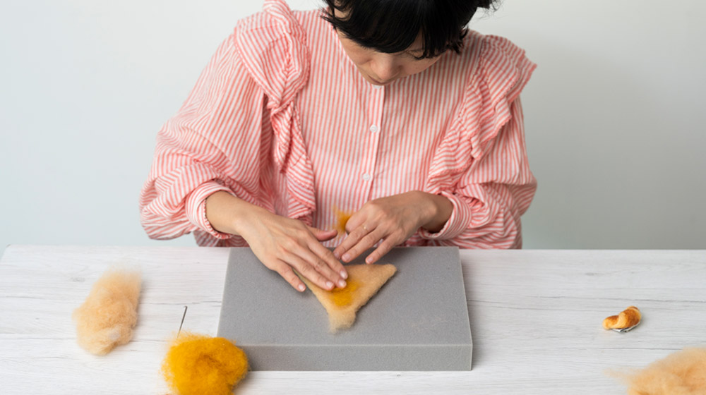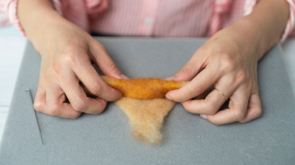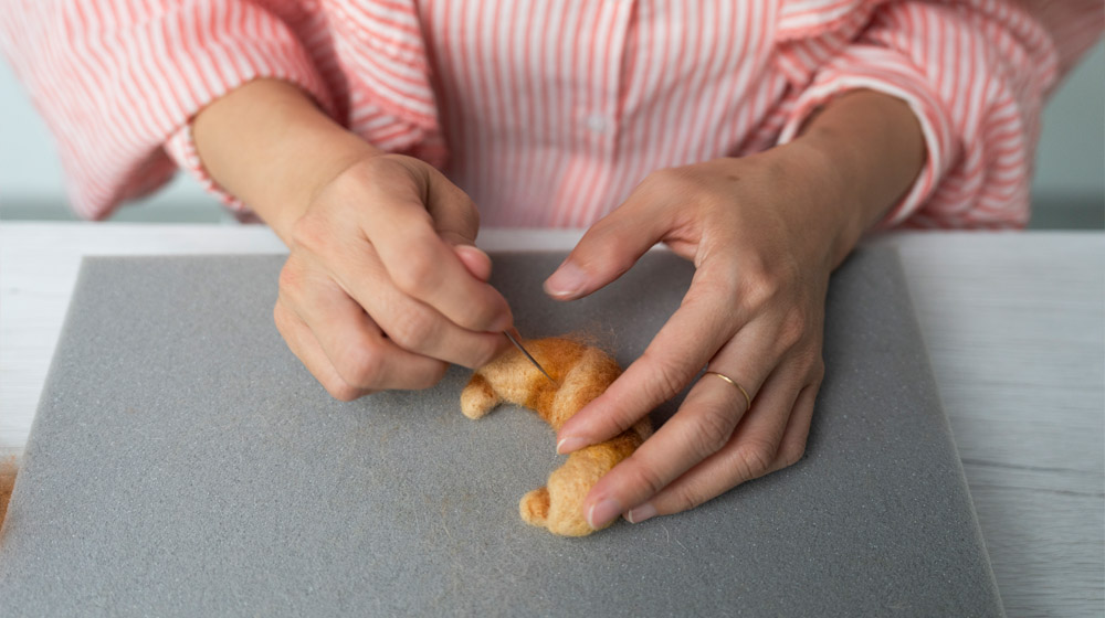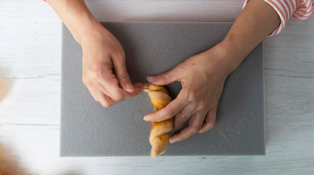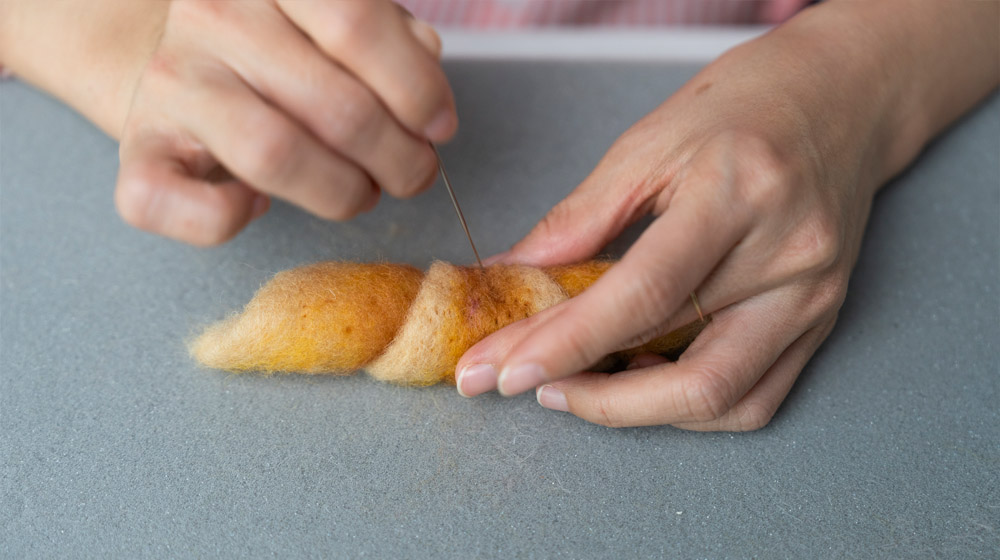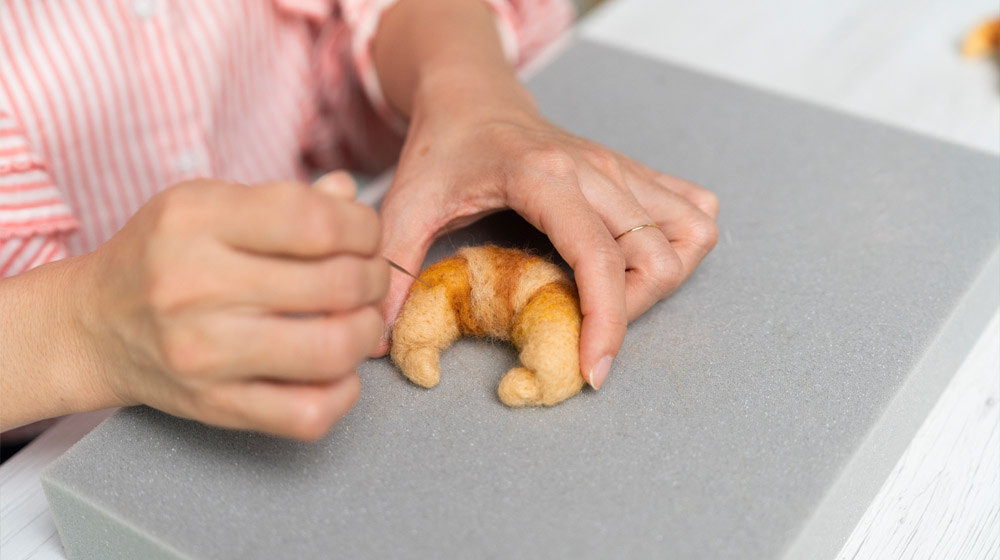 Riprendete l’ago e iniziate ad infeltrire la forma ottenuta. Partendo da un’estremità del croissant e andando piano piano ad infeltrire il dolcetto da forno. In questa fase bisogna porre particolare attenzione alle pieghe. L’obiettivo è amalgamare bene le varie parti del croissant.