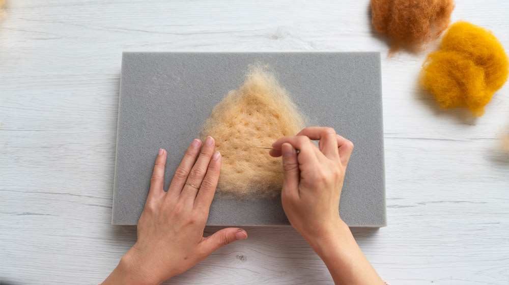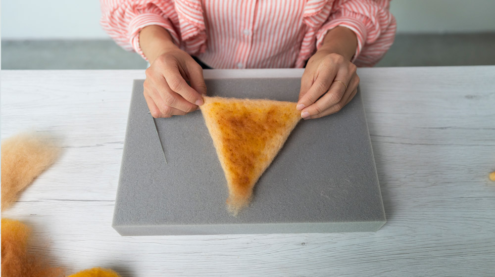 A questo punto iniziate ad infeltrire il triangolo ottenuto con l’ago. Partendo dal centro fino a raggiungere i bordi. Quando tutta la superficie sarà tutta ben infeltrita in maniera omogenea, girate il lavoro e ripetete le stesse operazioni anche sul retro.