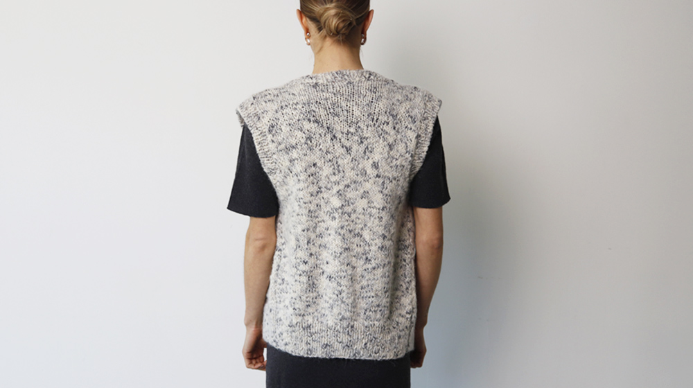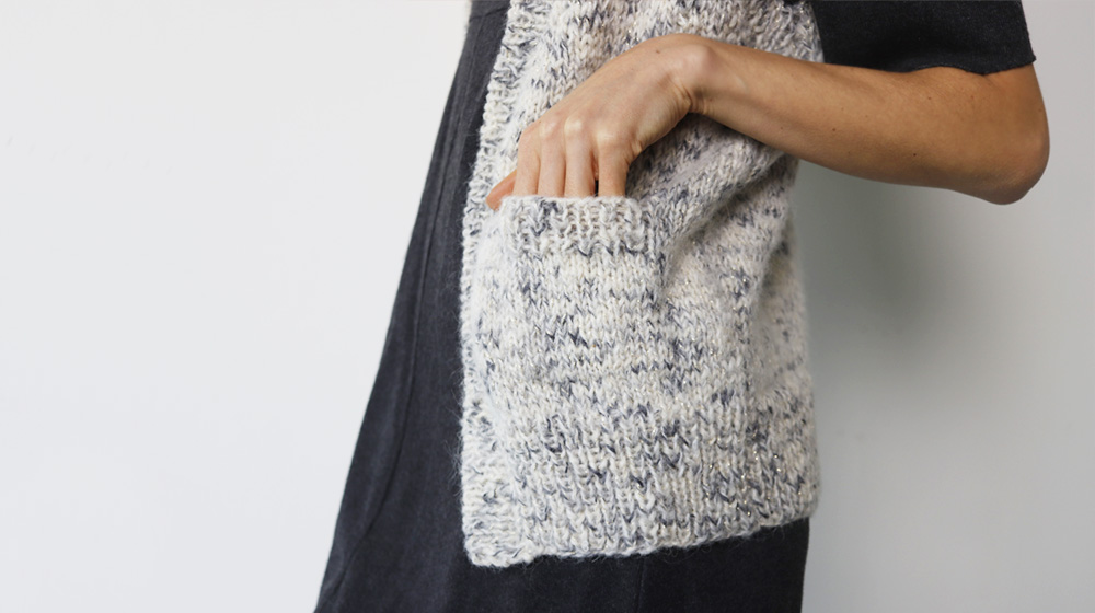 Eseguite una tasca su ciascun davanti come segue: con i ferri n° 7 EU / 10½ US sul diritto del lavoro riprendete le 15 (15, 17) maglie centrali sulla riga 7 (7, 9) lavorata a maglia rasata dopo il bordo inferiore a coste 1/1. Lavorate 18 (18, 20) righe a maglia rasata e 6 righe a coste 1/1. Chiudete il lavoro. Cucite i lati di ciascuna tasca con una cucitura invisibile. Cucite le spalle. Per il bordo dei davanti e dello scollo, con i ferri n° 7 EU / 10½ US riprendete le maglie attorno all’apertura centrale del capo, dalla punta del davanti destro alla punta del davanti sinistro, e lavorate 6 righe a coste 1/1 e 2 righe a maglia tubolare. Chiudete le maglie con l’ago da lana a punto maglia. Per il bordo del giromanica destro, con i ferri n° 7 EU / 10½ US riprendete le maglie attorno allo scalfo e lavorate 6 righe a coste 1/1 e 2 righe a maglia tubolare. Chiudete le maglie con l’ago da lana a punto maglia. Lavorate nello stesso modo il bordo del giromanica sinistro. Chiudete il bordo dei giromanica e i fianchi.