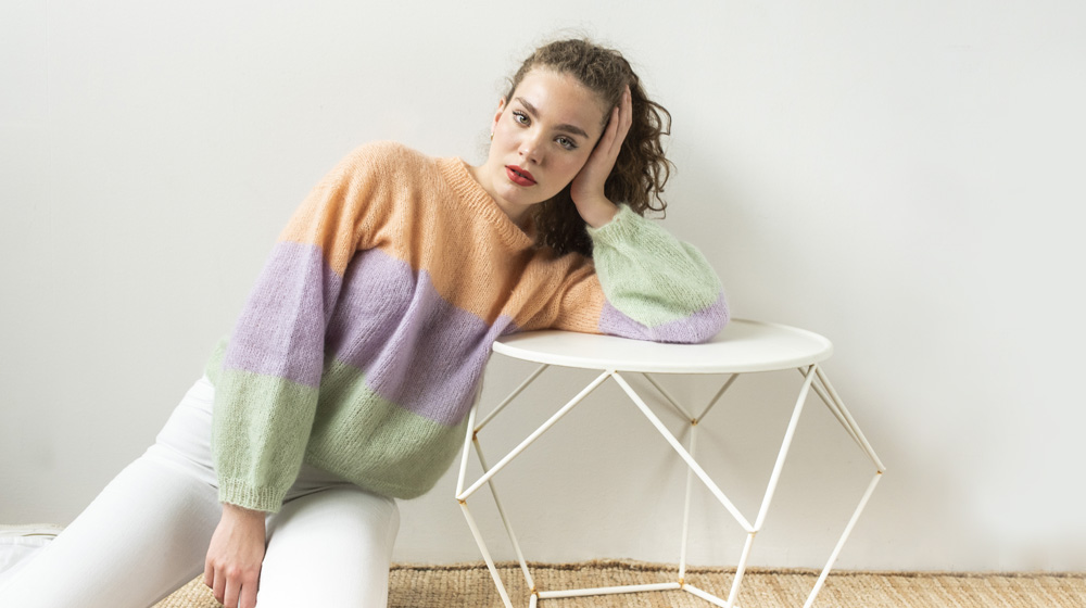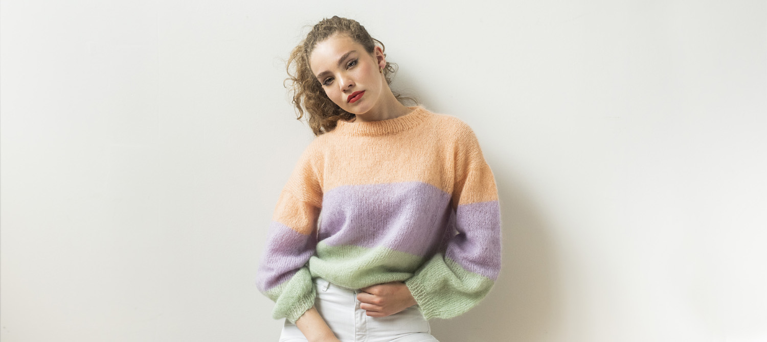 Questa piccola introduzione per presentarvi il pattern di oggi. Un maglioncino a righe alte, sono 3 in tutto. Realizzato con il prezioso Fluffy in mohair e seta. I colori sono pastello e sono stati scelti per creare un leggero effetto contrasto. Tu però sullo shop puoi trovare le sfumature che più ti piacciono e creare il maglioncino che vuoi.
