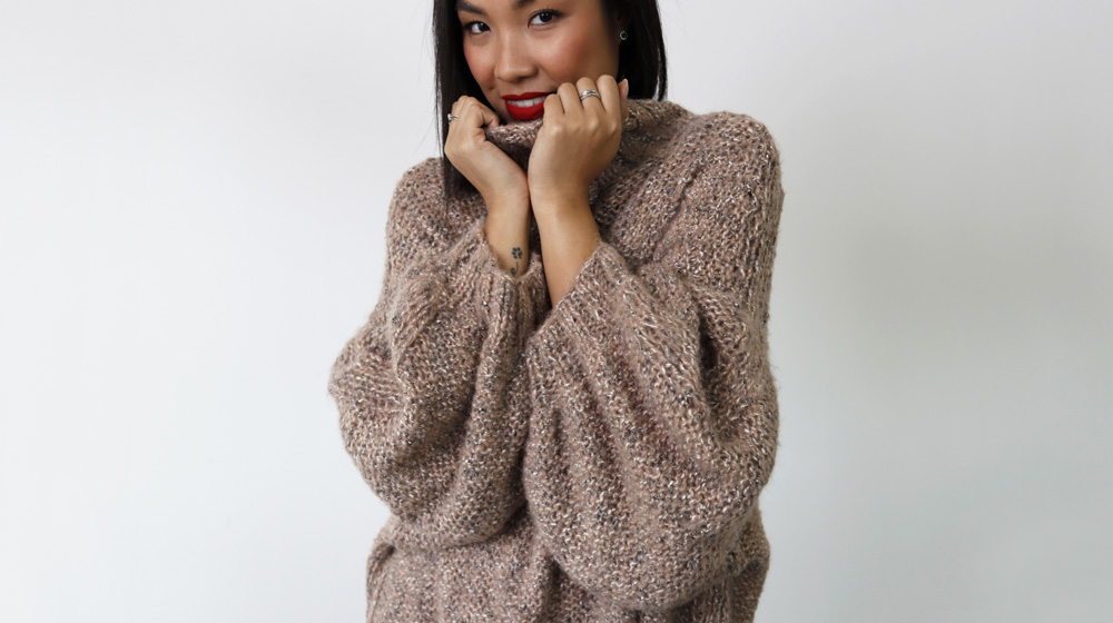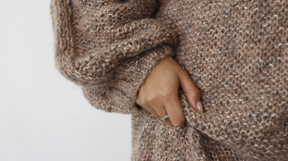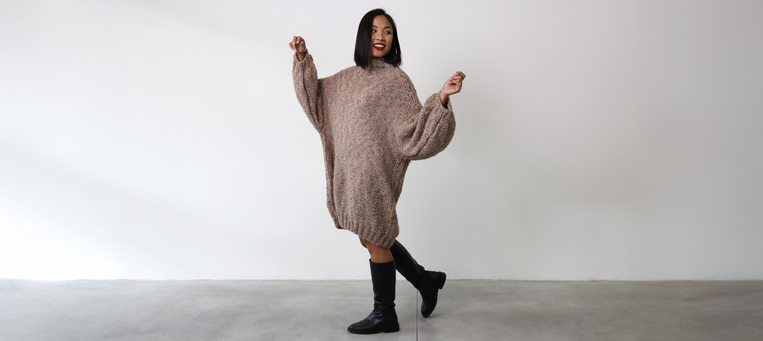 Quanto ci piacciono i maxi abiti! Da indossare con gli stivali, con le sneakers o con le ballerine. Sono femminili e pratici. E ce ne sono per tutti i gusti. Il nostro è caratterizzato da maniche a palloncino e collo alto a coste che richiama il motivo del polsino. Ma quello che lo rende davvero speciale - caldo e soffice - è il nostro filato Cape Town, una vera poesia della ritorcitura pratese. Pelosetto grazie all'alpaca, è un vero capolavoro della ritorcitura dove più elementi si intrecciano formando un filato dalla texture unica. E poi è composto da materiali riciclati!