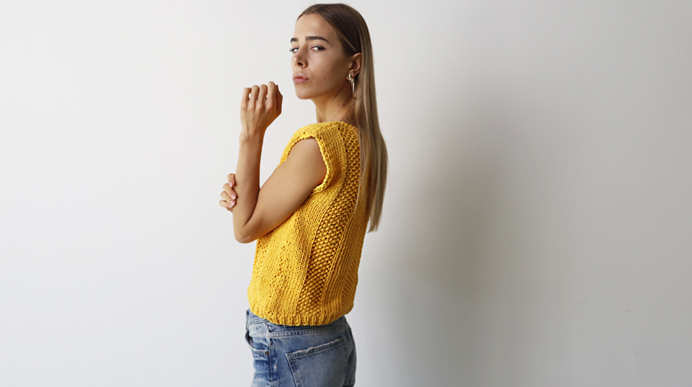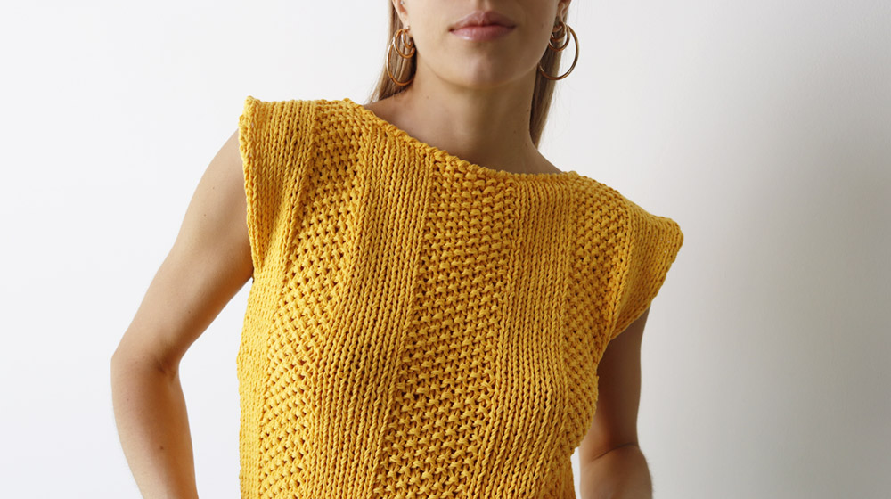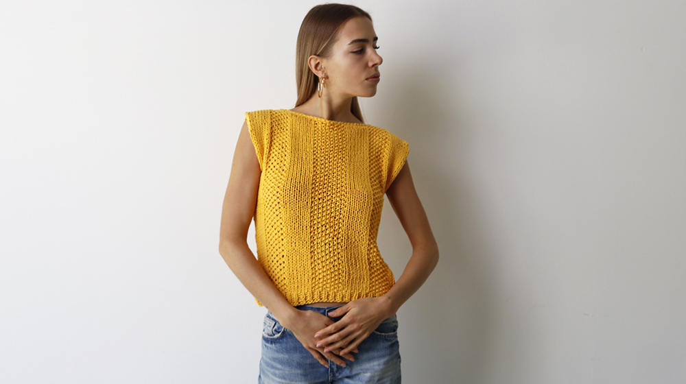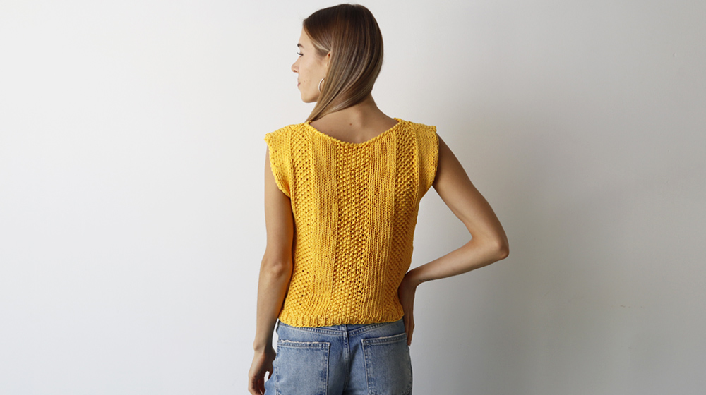 La canotta smanicata è lavorata in piano ed è formata da 2 pezzi, il dietro e il davanti. Il bordo dello scollo e dei giromanica è lavorato successivamente con l’uncinetto.