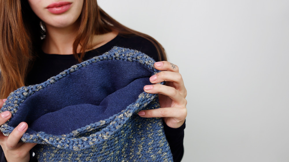 Dal feltro ricavate una borsa leggermente più piccola di quella lavorata all’uncinetto, alta 1 riga in meno dei pannelli davanti e dietro: i manici restano liberi; eseguite le cuciture con ago e filo da cucito. Fissate la fodera all’interno della borsa all’uncinetto, tutto attorno al margine superiore e ai lati, chiudendo allo stesso tempo il fondo di entrambi gli spessori.