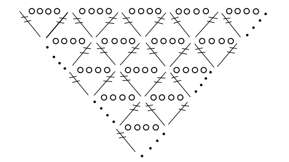 riga 3: lavorate 9 catenelle, 1 maglia alta doppia sulla maglia alta doppia della riga precedente, 1 maglia alta doppia, 4 catenelle, continuate così guardando lo schema.
