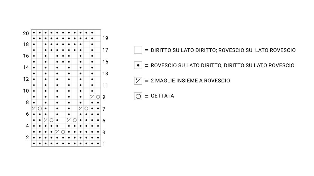 riga 3, lato diritto: 1 maglia a diritto, seguite lo schema fino a 1 maglia prima della fine, 1 maglia a diritto. Girate il lavoro