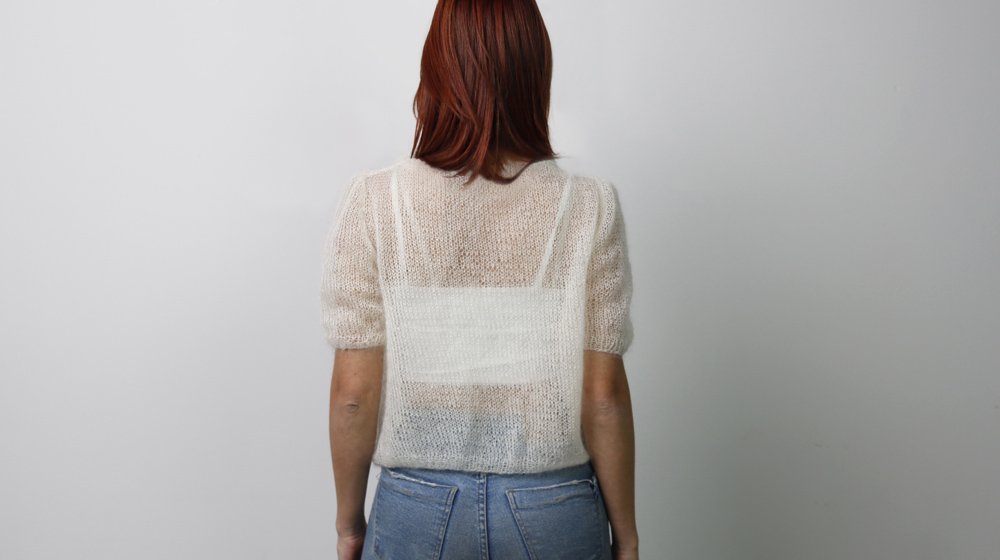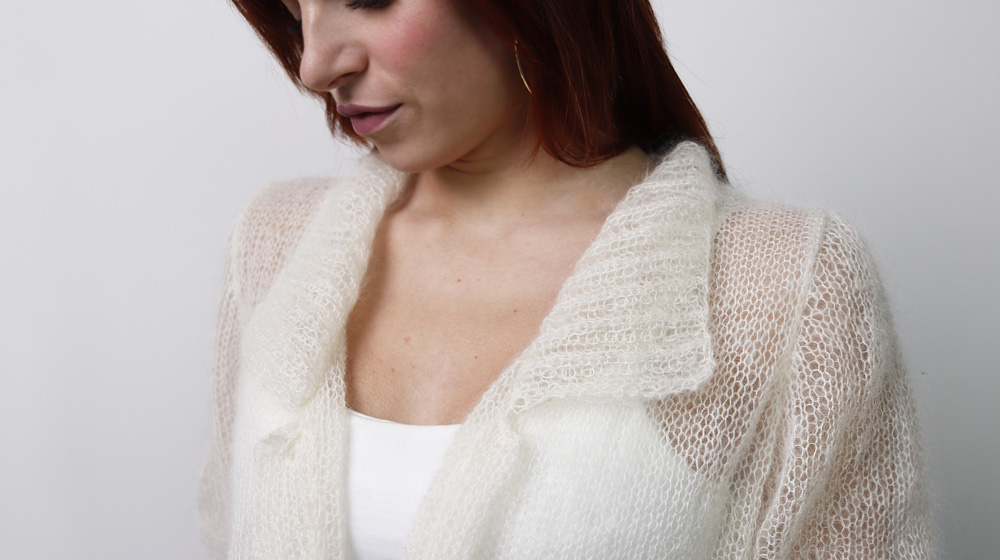 Oggi abbiamo in caldo per te un capo un po' particolare, ibrido. Non è un maglione, né una polo, né un cardigan ma bensì una polo aperta con maniche corte! Eravamo alla ricerca di qualcosa che esaltasse la soavità del filato in seta e mohair Fluffy. E crediamo di esserci riusciti. Questa polo aperta con maniche corte è impalpabile, come una carezza sulla pelle e da indossare in giornate tiepide. Diciamo che è un capo che non passa inosservato! Non è adorabile con sotto una semplice fascia e un paio di jeans?