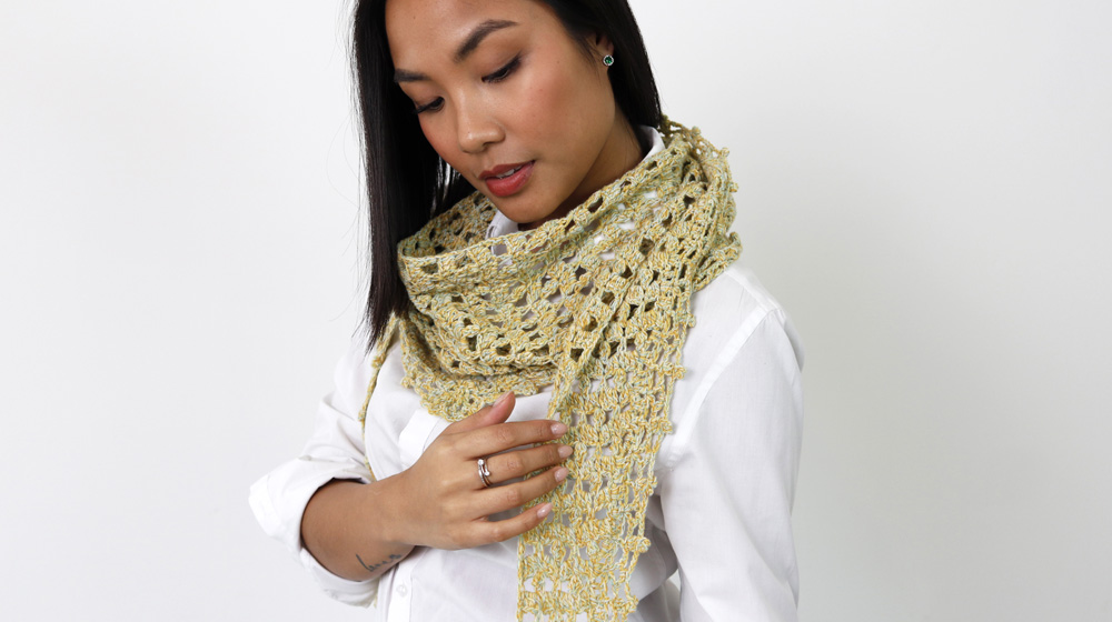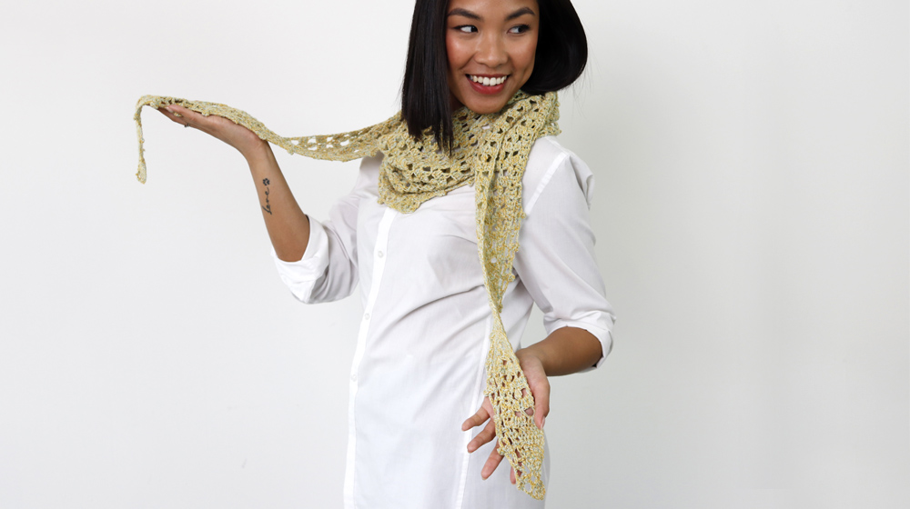 Oggi ti proponiamo il pattern per la realizzazione di una sciarpina traforata all'uncinetto con il filato God Save The Cashmere. La sciarpina traforata all'uncinetto è realizzata partendo da una punta e finendo nell'altra. Si inizia aumentando e si finisce diminuendo. Il risultato è un pizzo molto moderno, questo grazie al motivo che ricorda geometrie esotiche. Molto carini i pallottolini che corrono lungo tutto il bordo.